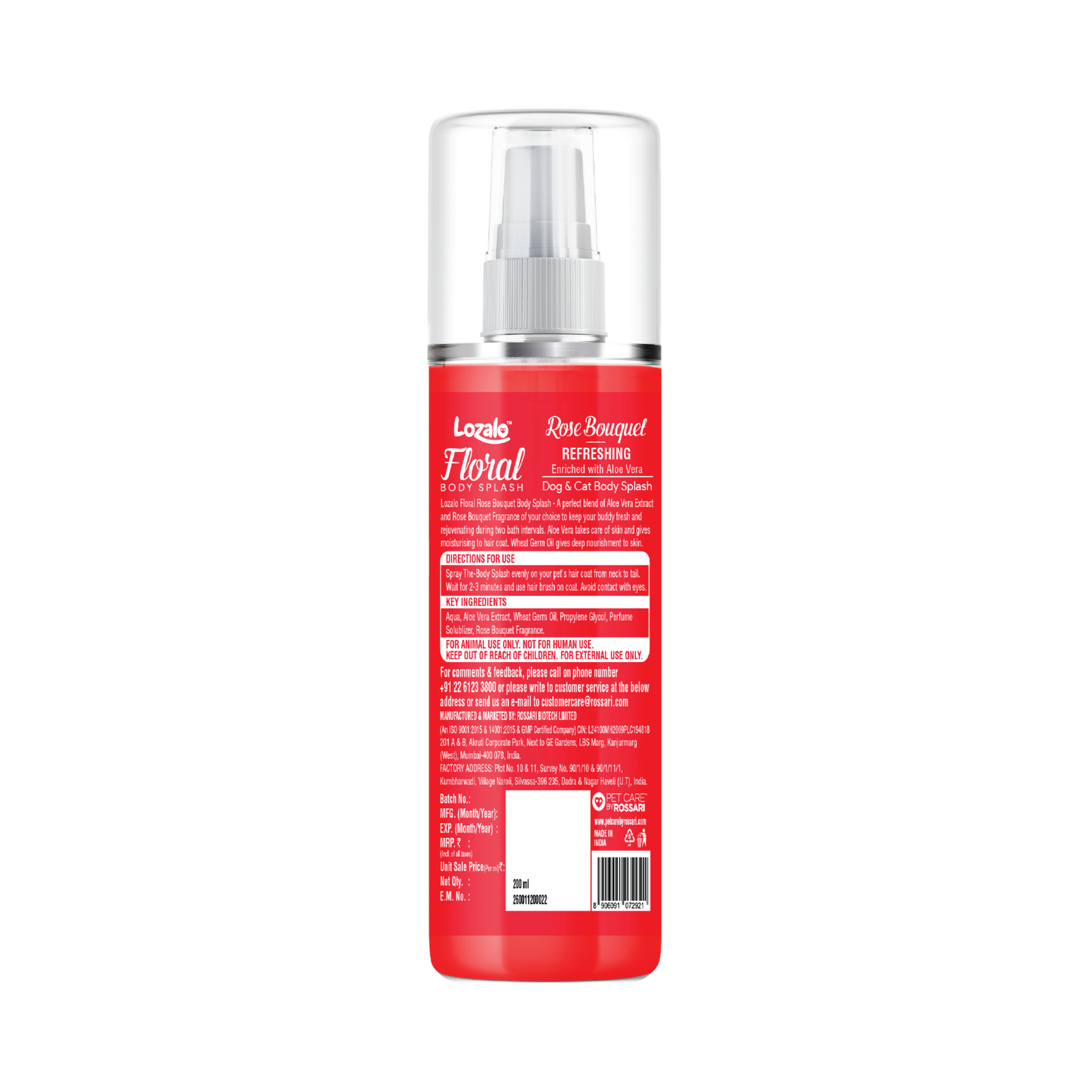 Lozalo Floral Rose Bouquet Body Splash is a perfect blend of Aloe Vera Extracts and Rose fragrance of your choice to keep your buddy fresh and rejuvenated during the interval between baths. Aloe Vera takes care of skin and moisturizes hair coat. Reetha Extract deeply nourishes the skin, leaving behind a long-lasting Rose fragrance.