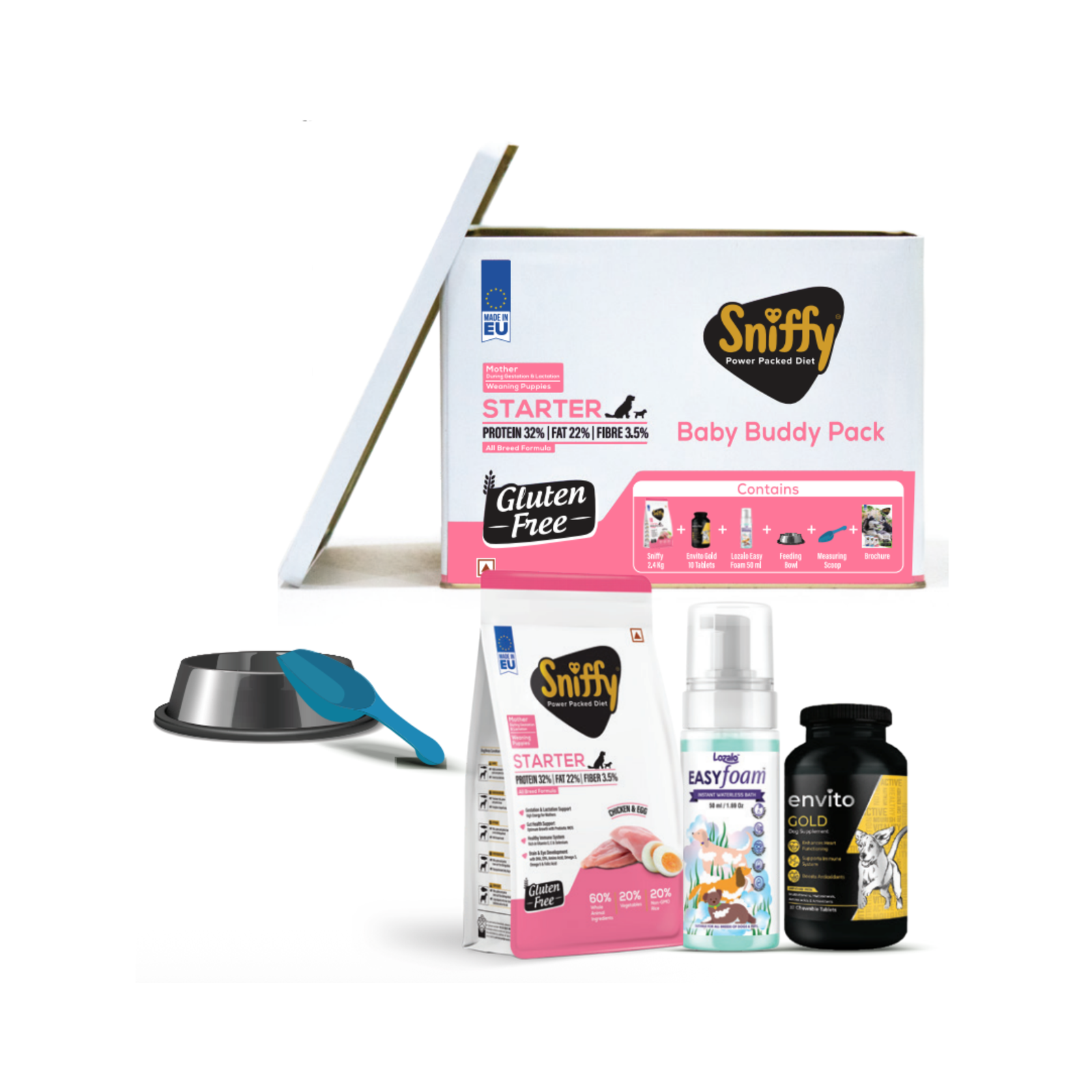 Baby Buddy Pack is the perfect bundle carefully curated to provide everything your furry friend needs for a healthy and happy start to life. This comprehensive kit includes gluten-free tarter food, a multivitamin supplement, and dry shampoo, all carefully selected to support your puppy’s nutritional and grooming needs.
