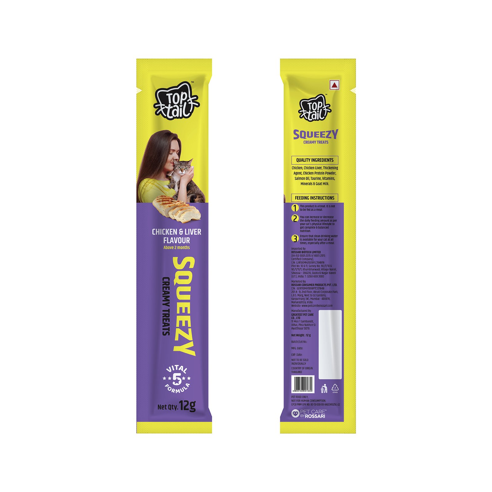 Toptail Creamy Treats- Chicken & Liver Flavour offers Squeezy Lickable Treats for Cats and are rich in Omega-3 & 6 Fatty Acids. The individual sachets ensure freshness and make portion control simple.
