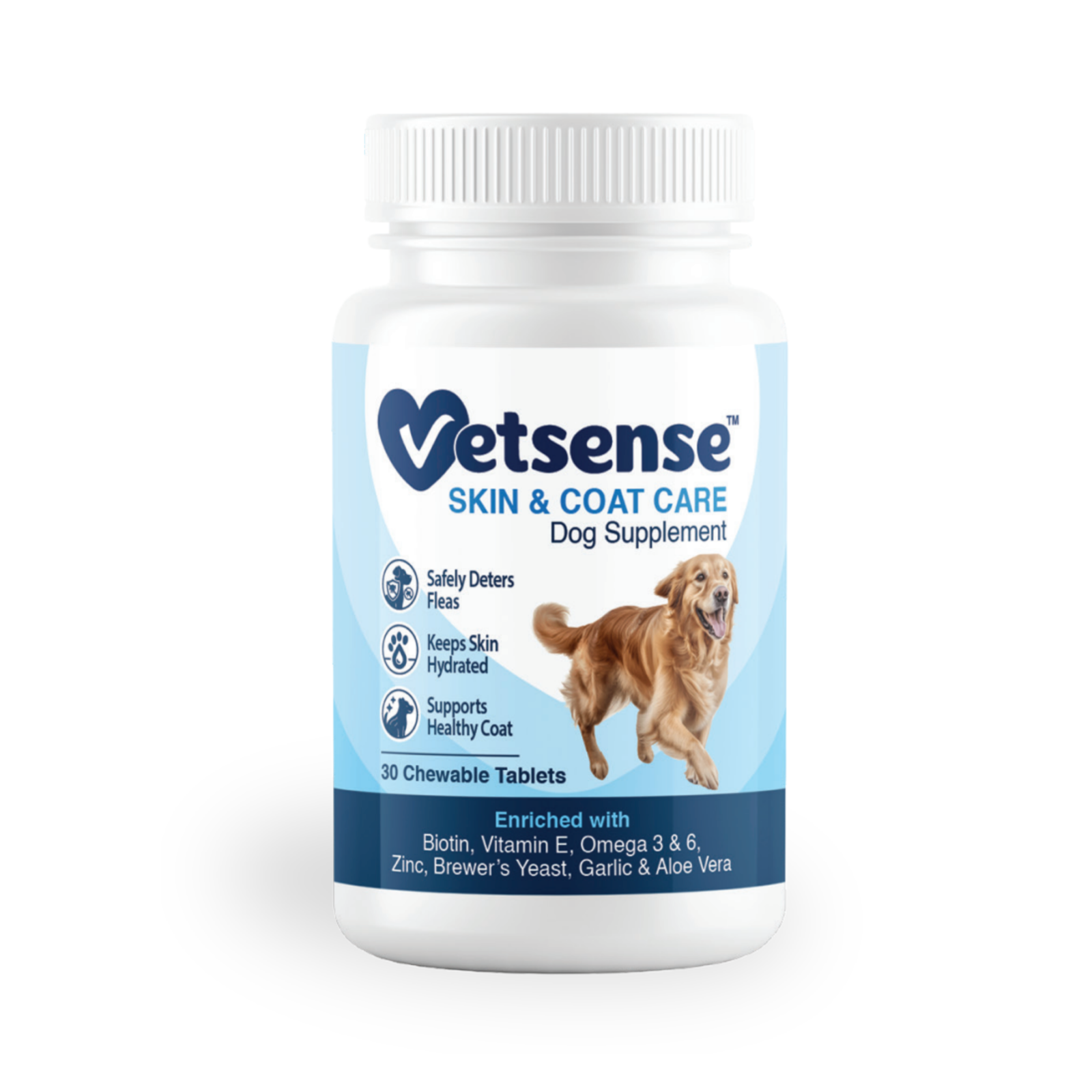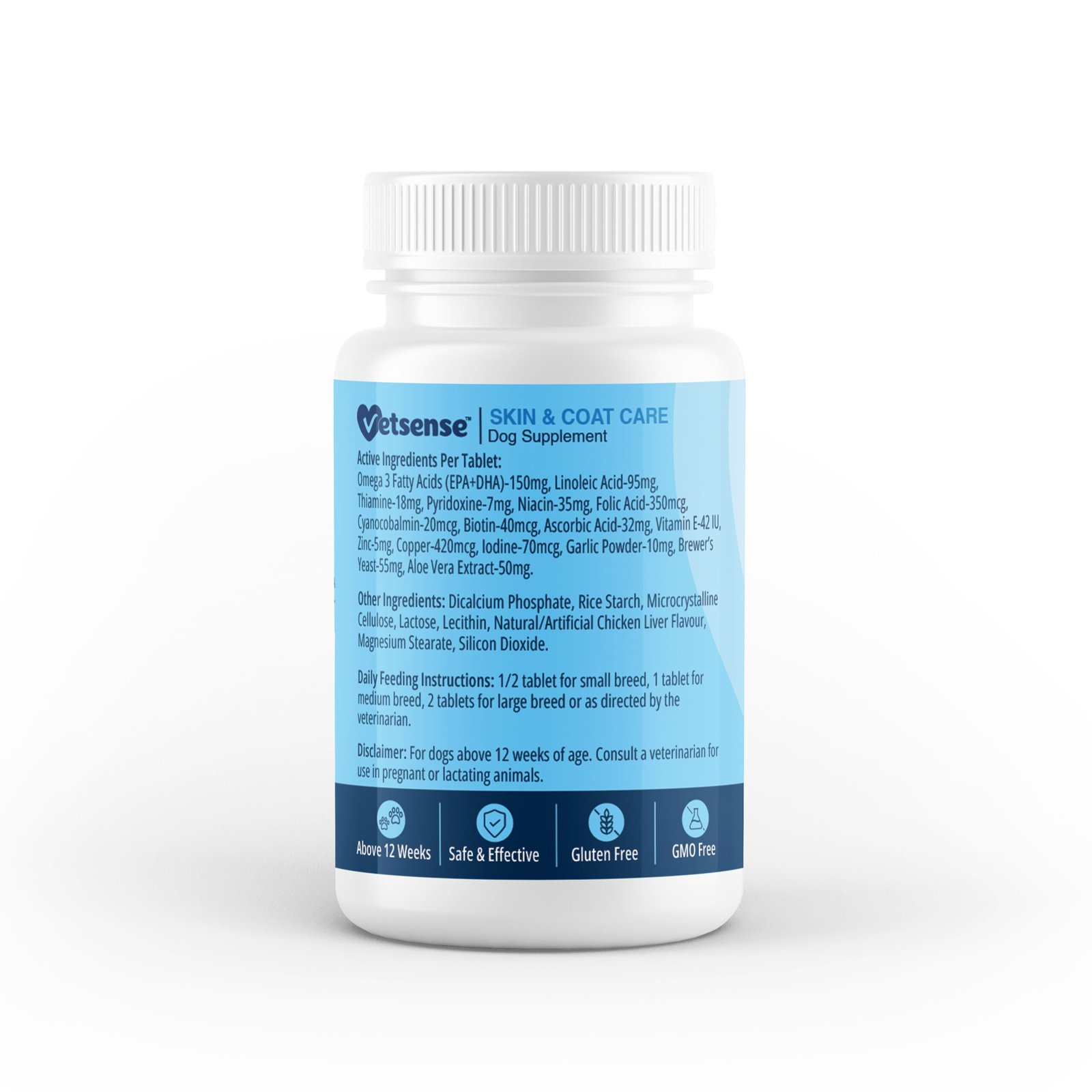Omega 3 fatty acids (EPA+DHA): 150 mg, Linoleic acid: 95 mg, Thiamine: 18 mg, Pyridoxine: 7 mg, Niacin: 35 mg, Folic acid: 350 mcg, Cyanocobalmin: 20 mcg, Biotin: 40 mcg, Ascorbic acid: 32 mg, Vitamin E: 42 IU, Zinc: 5 mg, Copper: 420 mcg, lodine: 70 mcg, Garlic Powder: 10 mg, Brewers Yeast: 55 mg, Aloe Vera Extract: 50 mg.